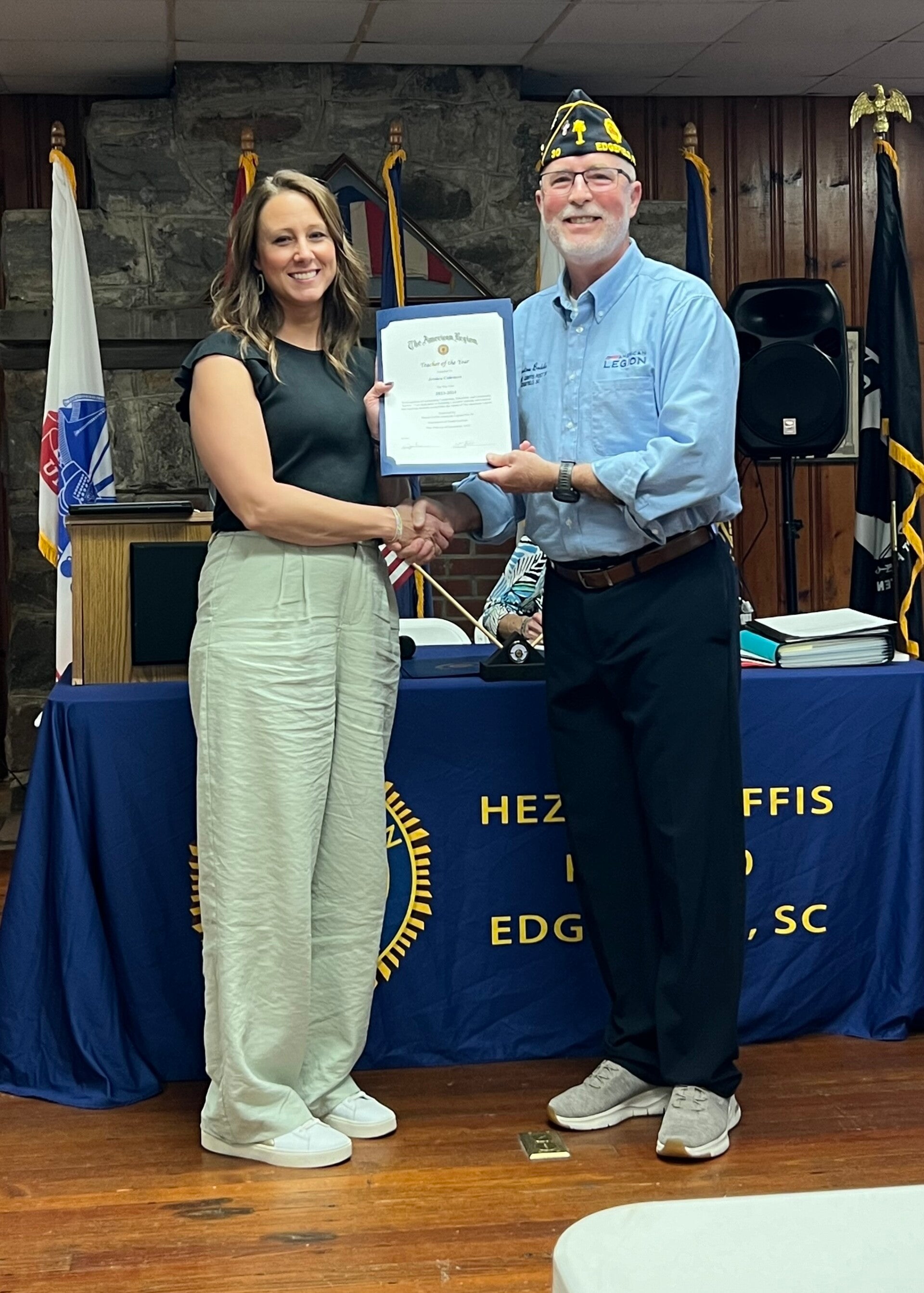 It marked a special event involving several Edgefield County friends and neighbors who enjoyed dinner with local veterans and the Unit 30 Auxiliary as the prelude to what resulted in another memorable monthly meeting. Among the highlights were welcoming our newest member, recognizing our 2024 Teacher of the Year, and honoring the 2024 Boys State and Girls State delegates.